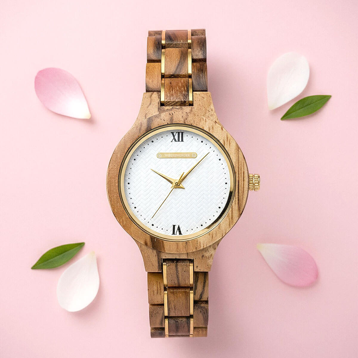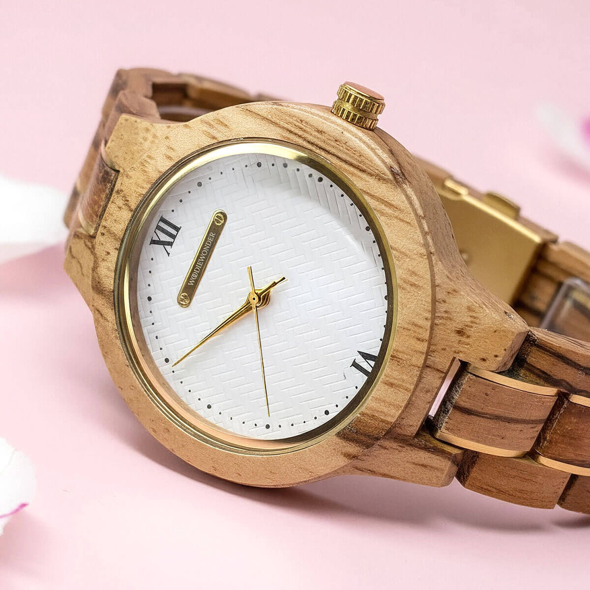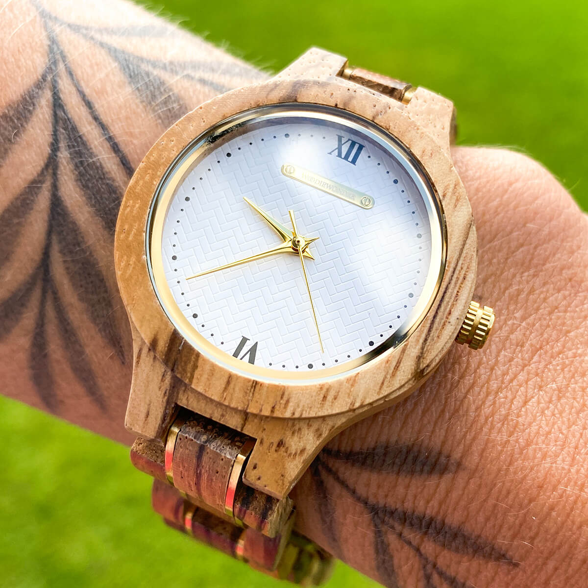 Odkryj wyjątkowy zegarek, który łączy w sobie elegancję naturalnego drewna Zebrawood z wyjątkową wytrzymałością. Przeplatany subtelnymi, złotymi wstawkami z pewnością zachwyci każdą kobietę ceniącą sobie styl i niepowtarzalność.