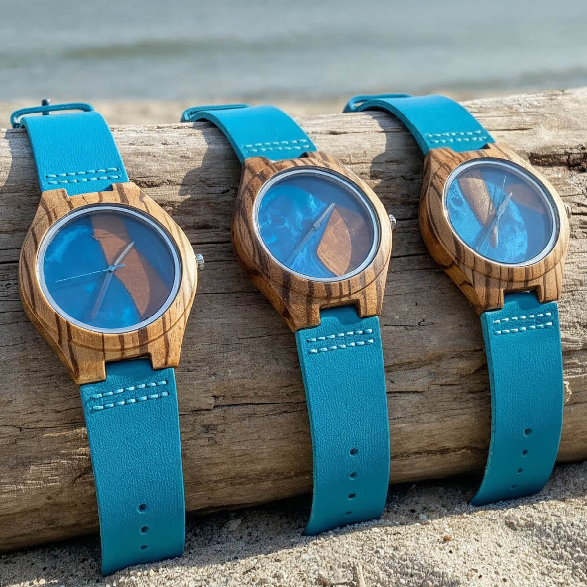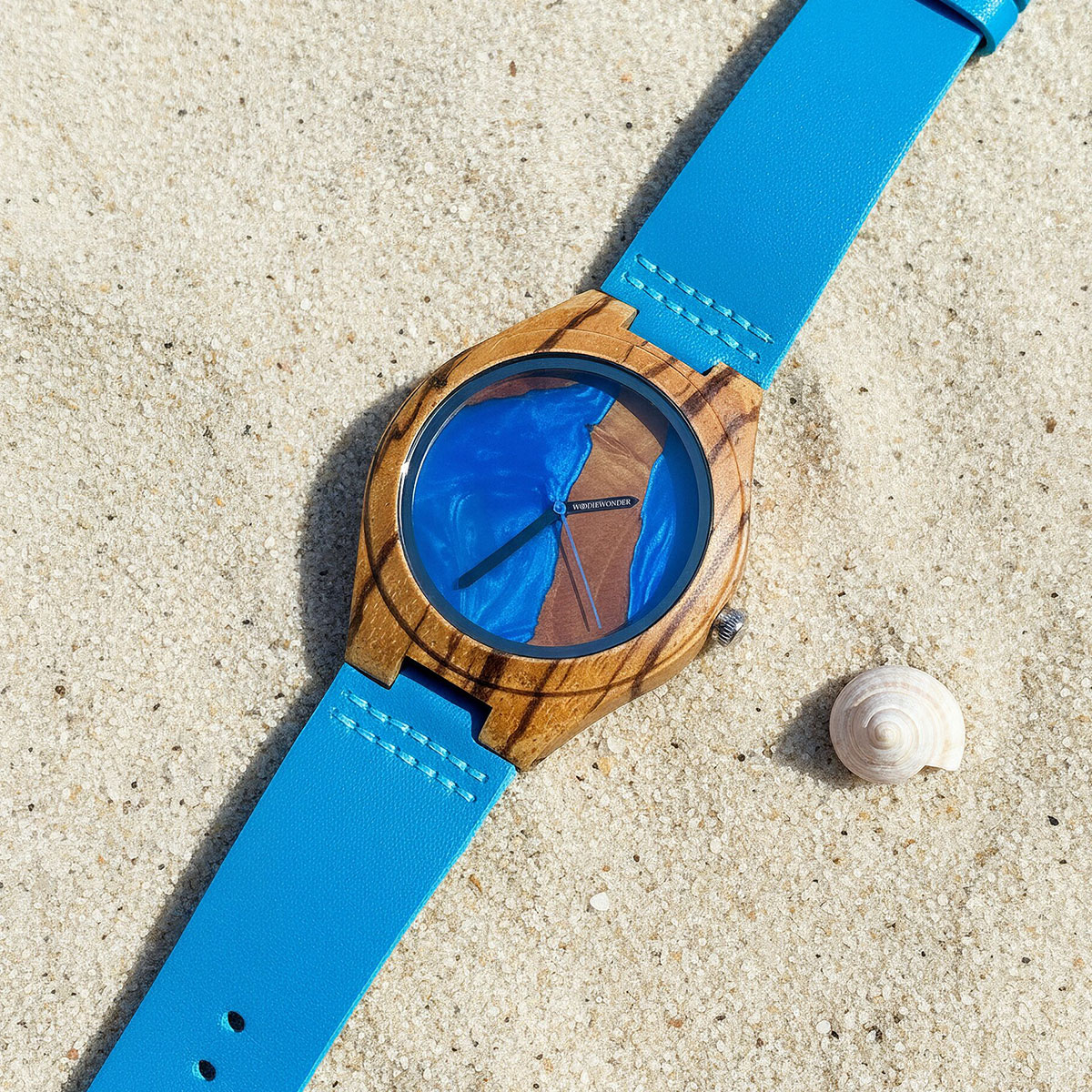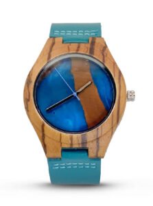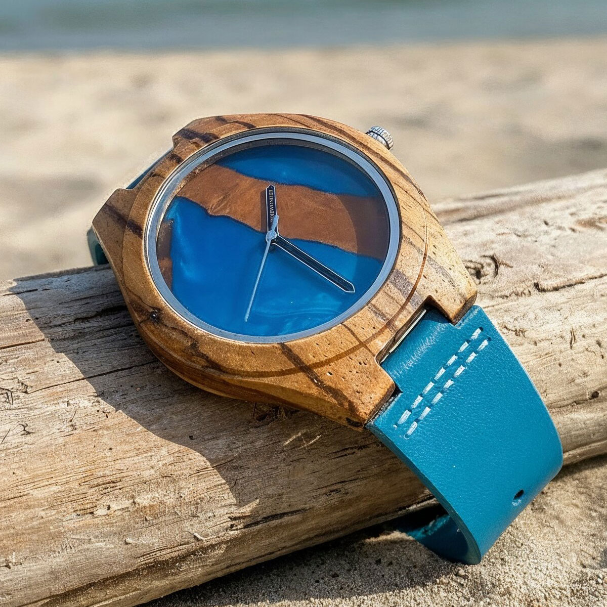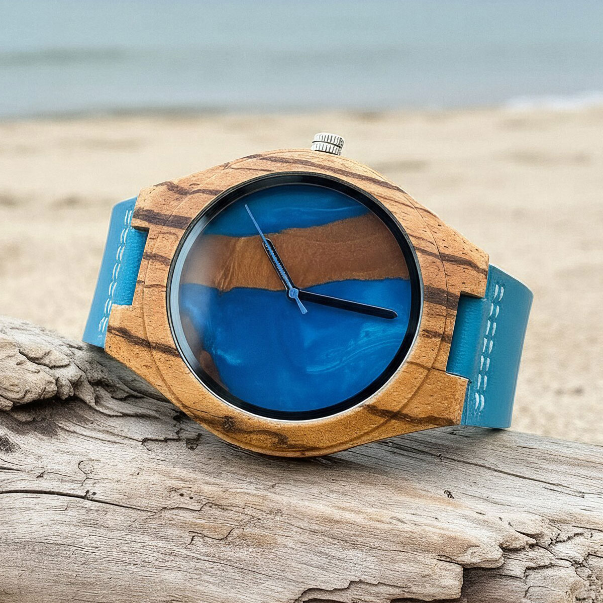 Tarcza zegarka harmonijnie łączy drewno z żywicą epoksydową, tworząc efektowną kompozycję. Koperta wykonana jest z drewna zebrawood, nadając zegarkowi elegancji i gwarantując dużą trwałość. Każdy model jest unikatowy, z niepowtarzalnym wzorem, który czyni go naprawdę wyjątkowym.