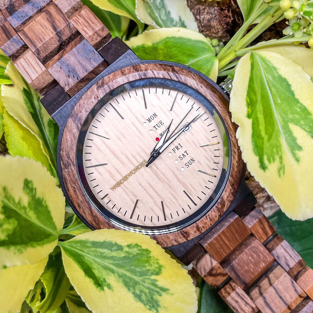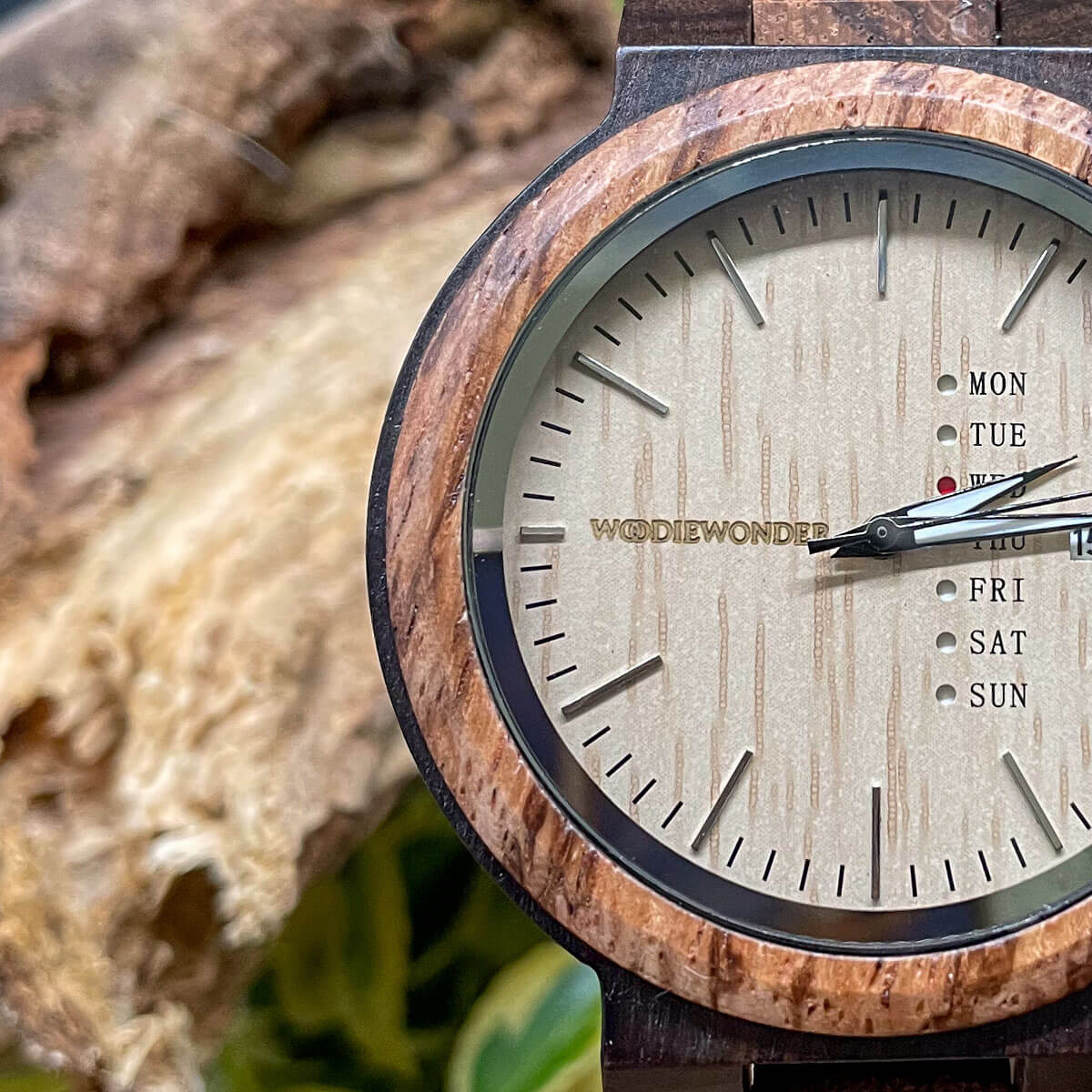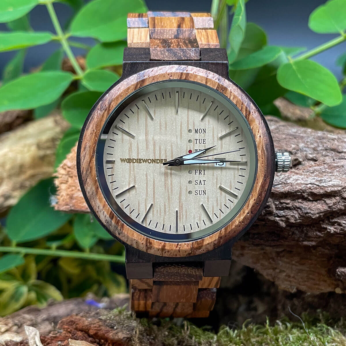 Elegancki męski zegarek, który łączy precyzję japońskiego mechanizmu z naturalnym pięknem zebrawood i hebanu. Tarcza posiada datownik oraz dni tygodnia, dzięki czemu zapewnia wygodę i praktyczność, tworząc niezastąpiony dodatek do Twojej stylizacji.