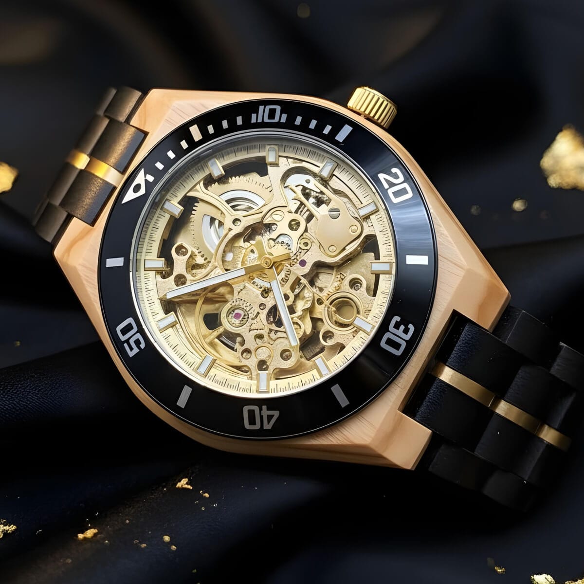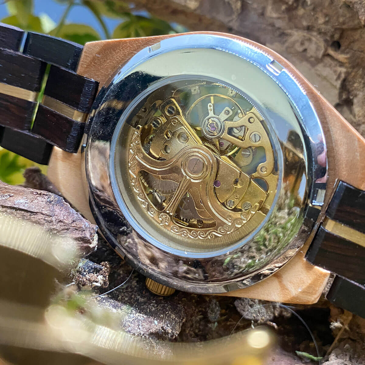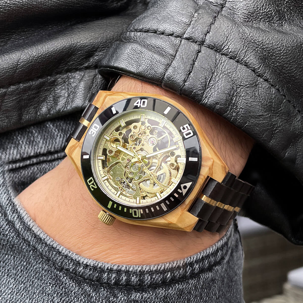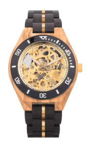 Zegarek z bransoletą z hebanu i tarczą z drewna oliwkowego, napędzany złotym mechanizmem mechanicznym o zaawansowanej konstrukcji. Łączy w sobie eleganckie drewniane materiały z nowoczesną technologią, oferując luksusowy wygląd i doskonałą jakość wykonania.