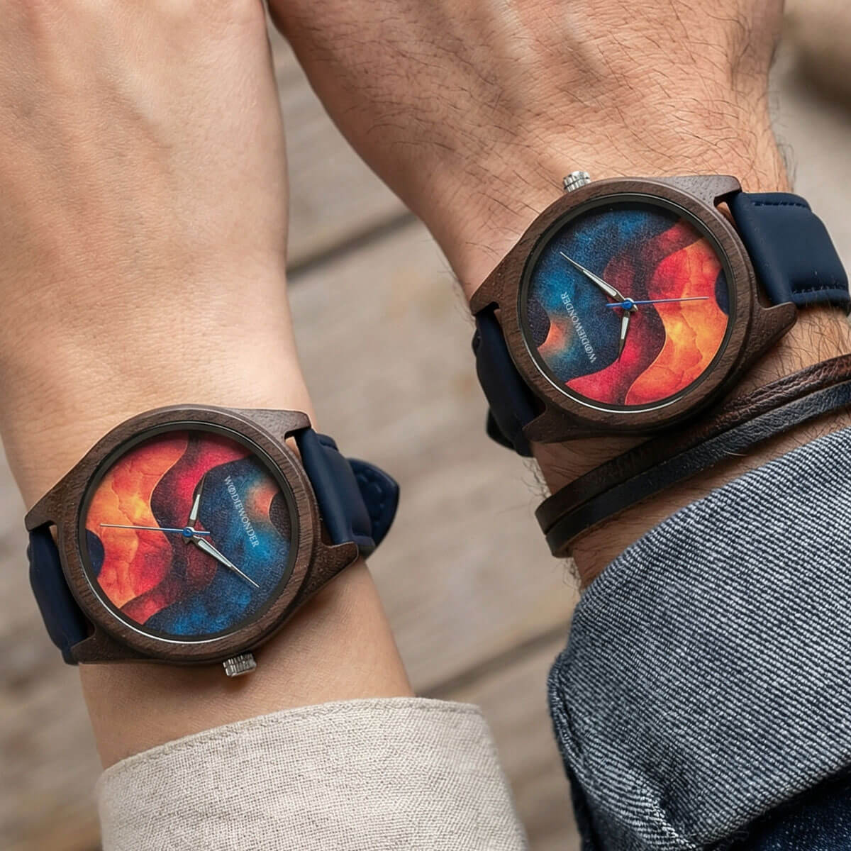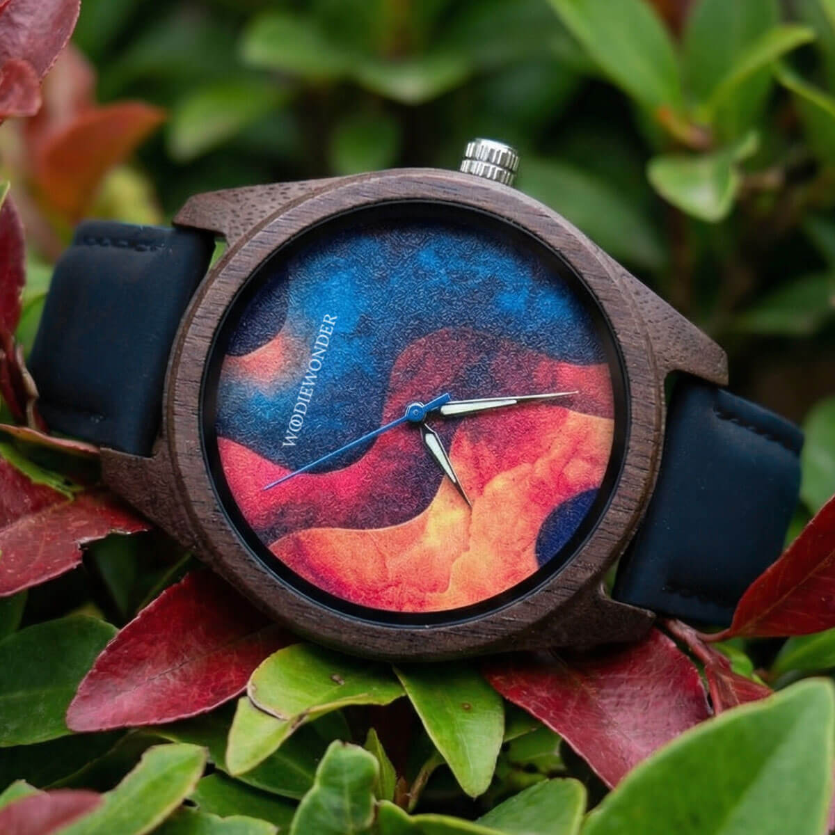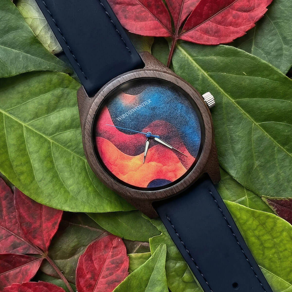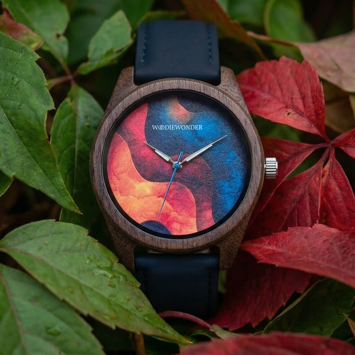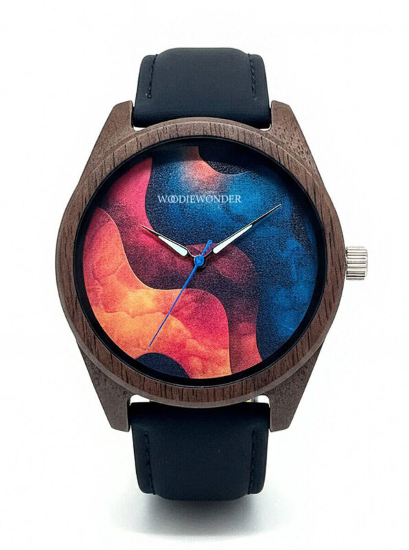 Zegarek o wyrazistej tarczy z organicznym wzorem inspirowanym naturalnym ruchem fal, który stopniowo przechodzi w głęboki, ciemnoniebieski odcień. Dynamiczna faktura nadaje całości charakteru, zachowując przy tym elegancki i stonowany wygląd. Koperta wykonana z orzechu w połączeniu z naturalną skórą tworzy harmonijną, ponadczasową kompozycję.